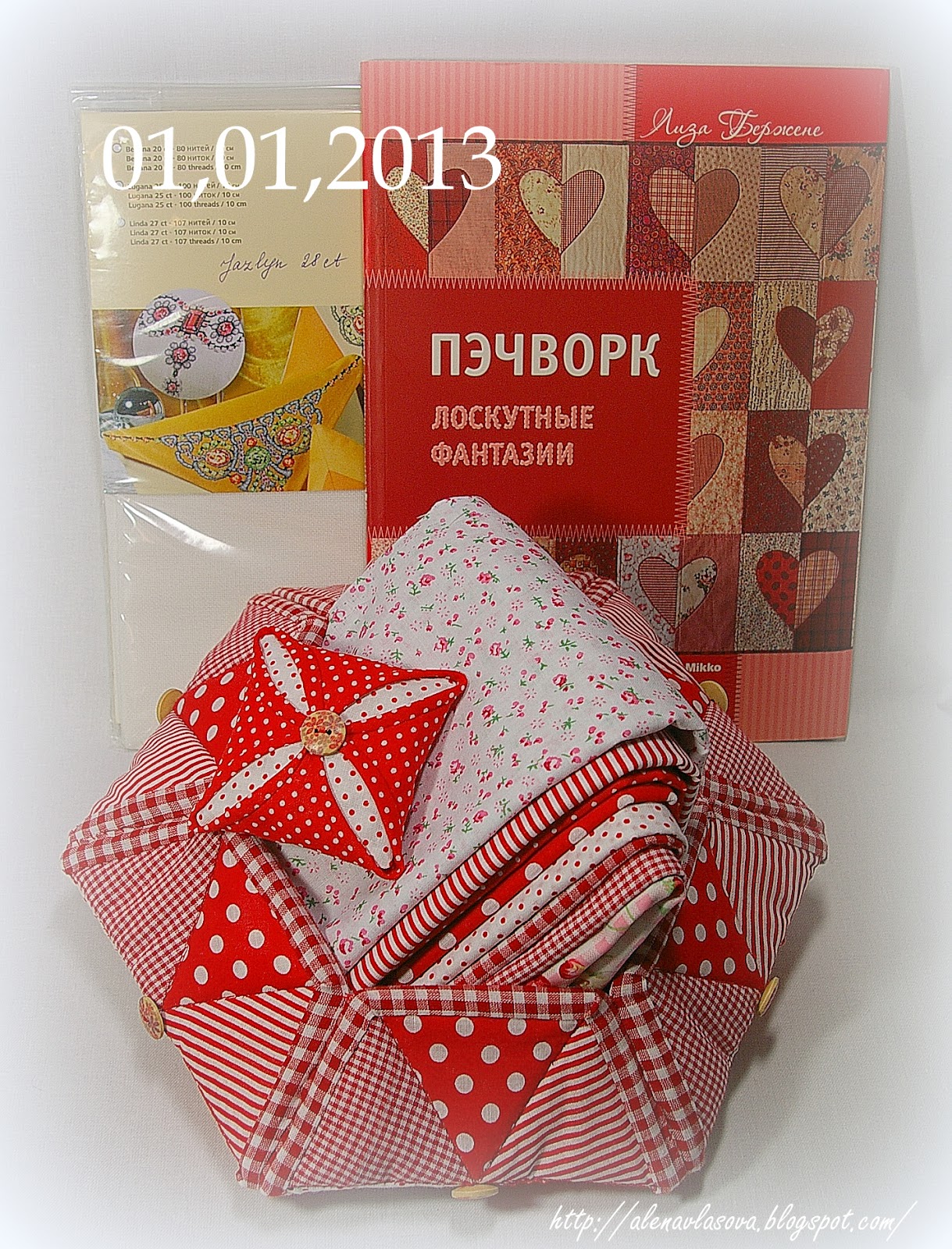 которая состоит из коробочки-шкатулки, игольницы, 8 отрезов ткани по 50 на 50 см, белой канвы 28 каунта и книги по печворку Лизы Бержене. Книга рассчитана на тех, кто только хочет приобщиться к искусству резать ткань на куски, а потом сшивать:)) С подробными инструкциями и идеями как раз ко дню святого Валентина, я думаю. Уж очень много там красно-розово-сердечного:)))