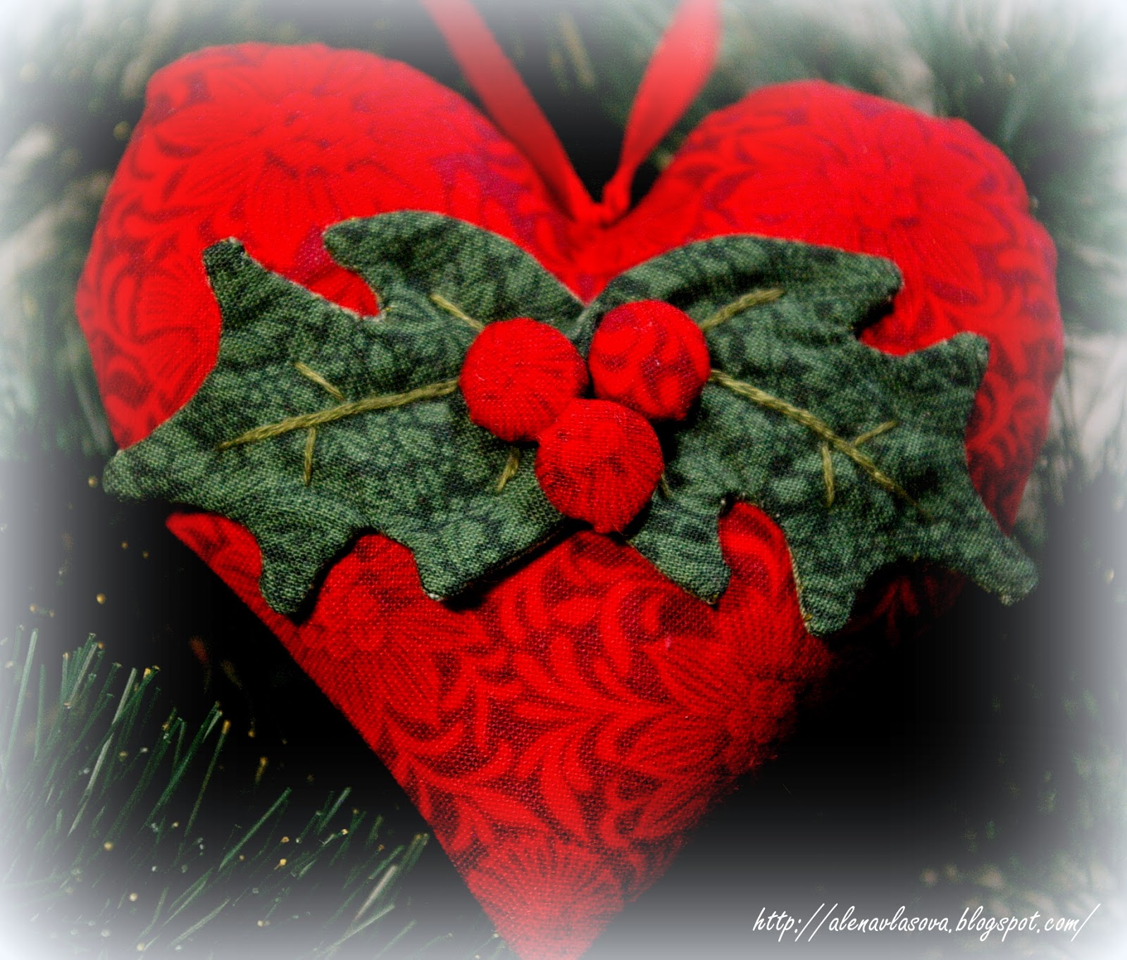Давно-давно я не шила-вышивала сердечек. Соскучилась. Решила быть сердечкам к Новому году!:))) Для себя вышиваю сердечки с ёлочками. Для подарков сшила сердечки с веточками остролиста. Яркие-яркие, даже фотографировались с трудом:))