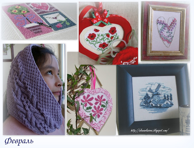 Февраль. Интересно что этот сиреневый снуд пользовался спросом весь год, до сих пор самое большое количество заходов через поисковые системы именно на этот пост (не считая календаря, конечно:)) Цветочные сердечки оба подарены, мельница подарена. Сердечко из совместного проекта вышивала для мужа, осталось дома:))