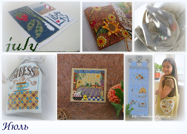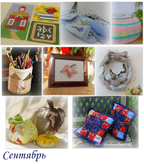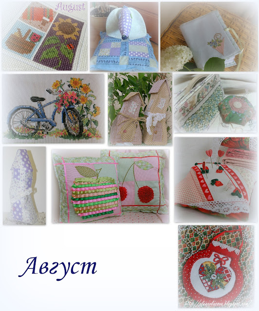 Август. Подушки и таксу невозможно забрать у детей для постирать, носятся с ними постоянно, спят, сидят, играют, всё на подушках:))) Подушек нам нужно много, как оказалось:))) Блокнотом пользовалась. Велосипед не оформлен. Сиреневый домик и обе игольницы подарены. Новогодний шарик подарен.:)))))) В коллаж не включила подсолнуховый семплер, который закончила в августе, но не оформила и фото готовой работы тоже нет. Но я его очень люблю, к лету обязательно оформлю и на стенку его!:))))