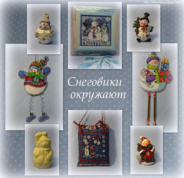 Знаете, снеговики совсем не моя тема:)) Я их мало вышиваю, у меня мало их дома, а из новогодних атрибутов мне ближе ёлки и колокольчики-бубенчики всякие:))) Зачем же я записалась в Танин флешмоб? - спросите вы:)) А потому что даже не обращая внимания на салфетки, кульки, упаковочную бумагу, ткани со снеговиками и даже парочку подаренных - на вполне приличный коллаж набралось!:)))))