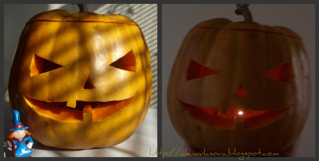 Случился и в нашем доме маленький праздник. Девчёнки ждали и готовились с пятницы. Выбирали тыковку, рисовали рисунки и жаловались что почему это, вот еще, как это, разве нельзя одеть страшные одежды и пройтись по соседям конфет насобирать?!)) Не случилось. Зато случилось напугать папу страшшшшной светящейся физиономией фонаря Джека.