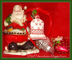 Попозже сделаю такой-же красный колокольчик с бежевым рисунком, а пока меня потянуло на варешки. Тут долго не мучалась, слямзила ёлочку с готовой схемы, довышила снежинки и вот
