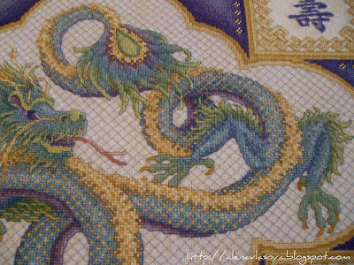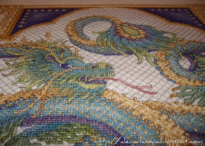 Я не стала добавлять синий бисер в сетку. Почему? Не от лени и нехватки времени. Нет. Я не ленивая.) И времени хватало. Но. Вот я отшила небольшой кусок фона и поняла что сетка с бисером выглядит не как фон, а как рыбацкая сеть. Без бисера - фон, с бисером - сеть. Вот появилась у меня стойкая ассоциация с попавшим в сеть драконом. Ну да, если бы я себе дракона вышивала, по вышивальным приметам к удаче в бизнесе, да и собстно во всём чём только можно удаче)), я бы возможно и поймала его в сеть. Но это подарок свёкру и как-то мне не хочется свёкра в сеть ловить. Ну совсем.) Муж забраковал синий бисер по другой причине. Сказал что дракон потерялся на таком насыщенном фоне. Выпорола. Уф, пороть не люблю еще больше, чем шить бэк. Окончательный вариант остался таким...