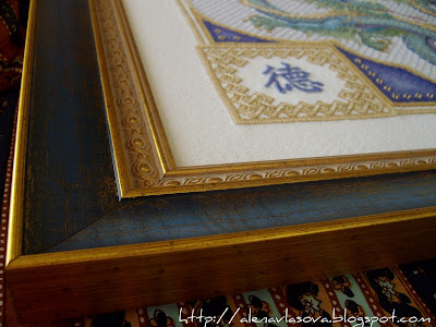 Идеального не нашла, хоть выбор и огромный, потому в багете соединены две рамы. Тёмно-голубая с золотыми затёртостями (как бы) и тонкая перламутровая с золотистой сеткой, которая оч хорошо сочетается с сеткой вокруг иероглифов.