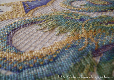 Конечно, я планировала довышить эту красоту до конца октября, но у мужа отложился вылет. Перенесли на две недели и у меня появилась фора.)) Это возымело действие чисто в моральном смысле. Я расслабилась, откладывала пару раз, переключалась на чтот другое и процесс проходил с еще большим удовольствием.) Да, под конец я поняла что это далеко не последний дизайн от Терезы Венцлер который буду вышивать. Мазохизм чесслово.) Но как это красиво! Поверьте, фото не передаёт всего блеска канвы-ниток-бисера, переливов цветов, сочетания тонов... Дракон выглядит живым.
