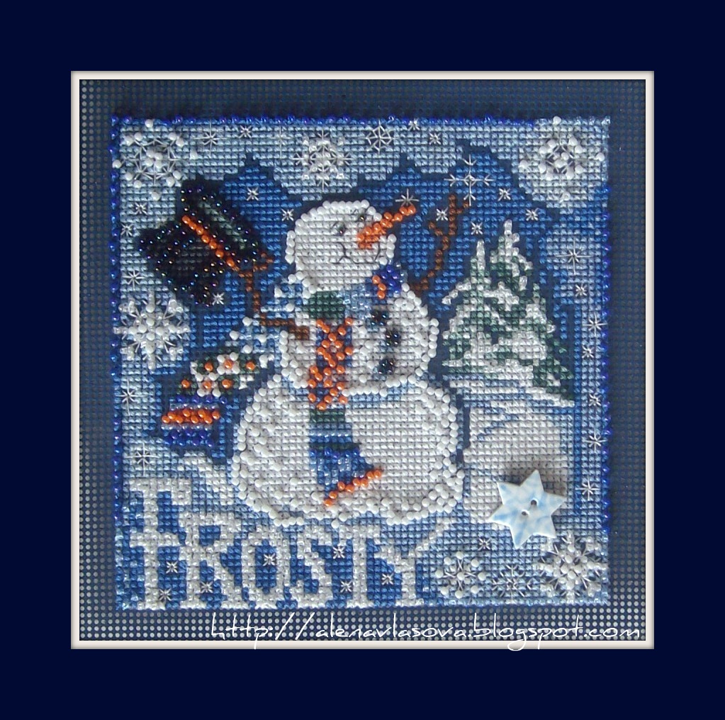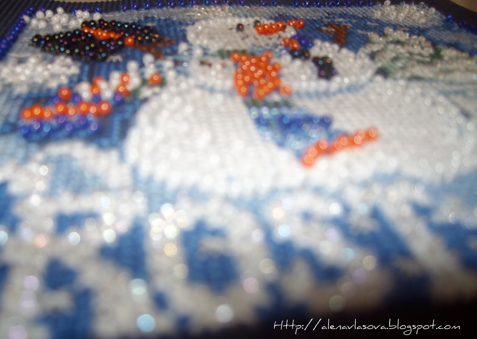 До этого снеговика, я наивно полагала, что вышиваю быстро. С этой малявкой 70*70 провозилась около недели. Ещё и бумага перфорированая...1. тёмно-синяя, глаза устают, 2. держать неудобно, рука устаёт, 3. много белой нитки, держать приходится за уже вышитое, руки мыла каждые 15 минут. И еще крест-полукрест, и бисер пришивается крестом-полукрестом. Уууууф!! Бисер пришился быстро, неча наговаривать, но на общем фоне...