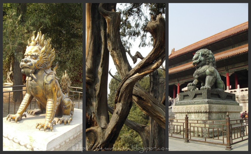 Эти красавцы львы восседают в Императорском Дворце Гугун, а про дерево ходит легенда. Вернее про два дерева, ветви которых переплетаются вот таким чудесным образом.