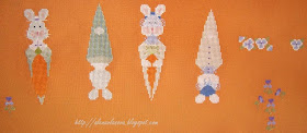 получились у меня совершенно неожиданно. Началось всё с  весны, которую девченки мои затребовали в свою комнату. (Я Весну-то закончила, жду рамочку, тогда и хвастаться буду:)) Им так понравился этот простенький дизайн, что они попросили "что-то такое-же маленькое ты мама разве нам не сделаешь на Пасху":)) Сделаю, конечно:)) Но, поскольку в этом году я решила красить яйца в традиционно коричневый цвет, традиционно луковой шелухой (вот так мне взбрендило), "что-то маленькое" хотелось подобрать в цвет, ну тоже взбрендило. Получились эдакие элегантные кролики в морковке с морковкой и яйца (ну во всяком случае они задумывались как яйца:)).