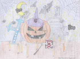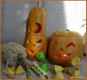 Потом уж девчонки нарисовали на тыковках симпатичные мордашки, я вырезала (как сумела), зажгла внутри свечи... и пару часов две красоты, с распущенными и взлохмаченными волосами носились по дому изображая ведьм. Получили свою порцию конфет, нарисовали картинки хеллоуинские и спокойненько уселись дослушивать очередного Гарри Поттера. :))