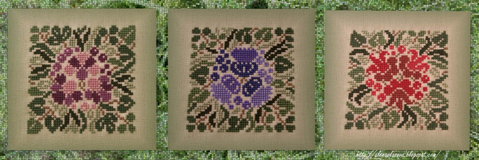 Это, конечно, очень и очень вольный перевод Паролиновского дизайна Fiori antichi, но вот так оно мне видится. Несколько цветочков, в обрамлении зеленых листьев, несколько вариантов, из которых я выбрала три, самых лаконичных.