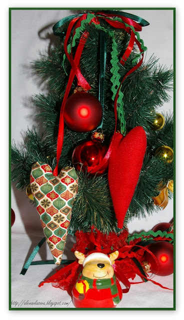 Симпатичная ткань с новогодним рисунком - сердечко раз, красный лён - сердечко два, ёлочные шары ( к сожалению зелёных, подходящих по цвету, я не нашла в ближайших магазинах, а ехать где-то уже некогда), ленточки-тесёмочки, те что были под рукой, тоже ничего не покупала специально:)) В результате позитив и праздничное настроение:))