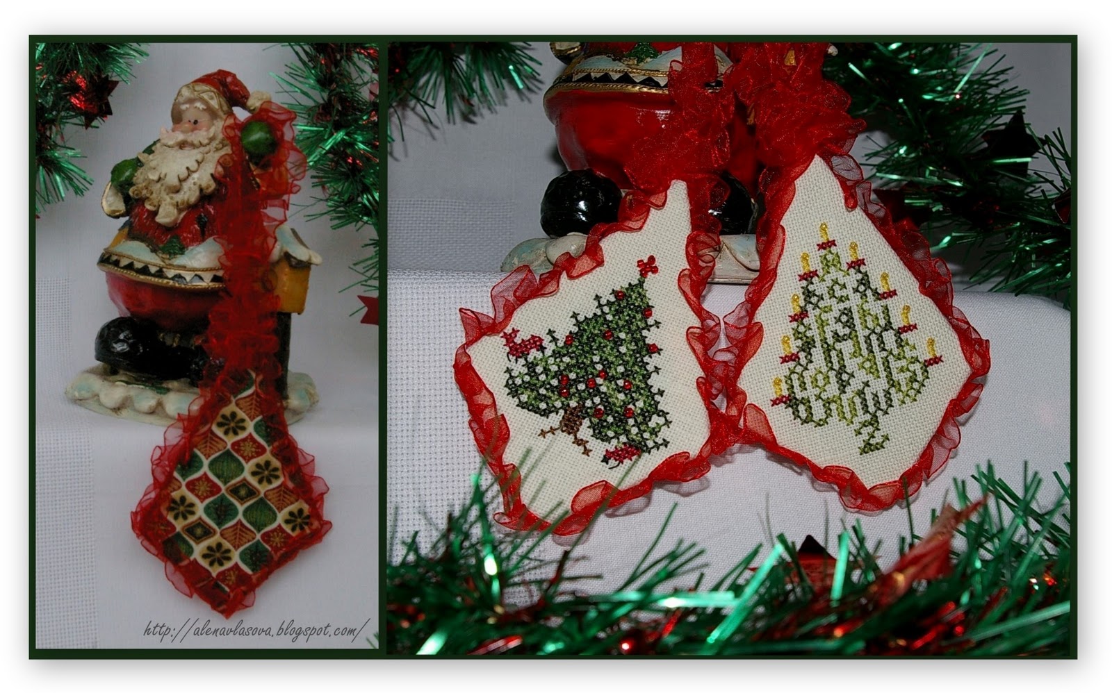Хорошо вам, у кого снег и зима, как зима! А у нас-то снег с дождём, второй день, до земли не долетает даже, тает и слякоть с грязью на дорогах мерзкая. Новогоднего настроения, до сих пор, нет. Внушаю я себе, как могу, что вот мол, будет и на нашей улице снег, и морозец ударит, и зима будет похожа на зиму!:) Поднимаю настроение новогодними вышивками. На этот раз две маленькие ёлочки. Как и предполагалось, уедут в подарок:)