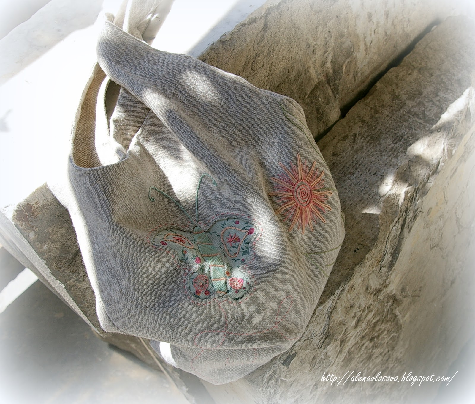 Конечно с историей:) Захотелось мне льняную сумку. И не то чтоб прям сумку, а простую такую торбу, без "наворотов". Нашла у себя хороший кусочек грубого серого льна, очень уж мне нравится цвет и текстура. Выкроила и застряла на пол пути:) Ну как-то...бедненько, решила я. И задумала чё-нить вышить, а как же без этого?! Такую бабочку, вырезанную в основной ткани, я видела где-то в журнале (вспомнить бы где:))... и понеслось. Нарисовала бабочку, вырезала, подложила ткань в цветочек, пришила...и опять зависла. Не понравилось. Достала ниточки и...вышивать-вышивать-вышивать-украшать. Сбоку добавила цветочек и вот оно, самое то. Не броско, не ярко, не много, я осталась довольна. То что хотела:)) Но тут смешной момент, я два вечера скрупулёзно боролась с этой бабочкой, чтоб получился эффект "неброскости":))) Это мне напомнило косметические процедуры. Когда чтоб выглядеть естественно нужно на себя тонну косметики наложить:)))))))