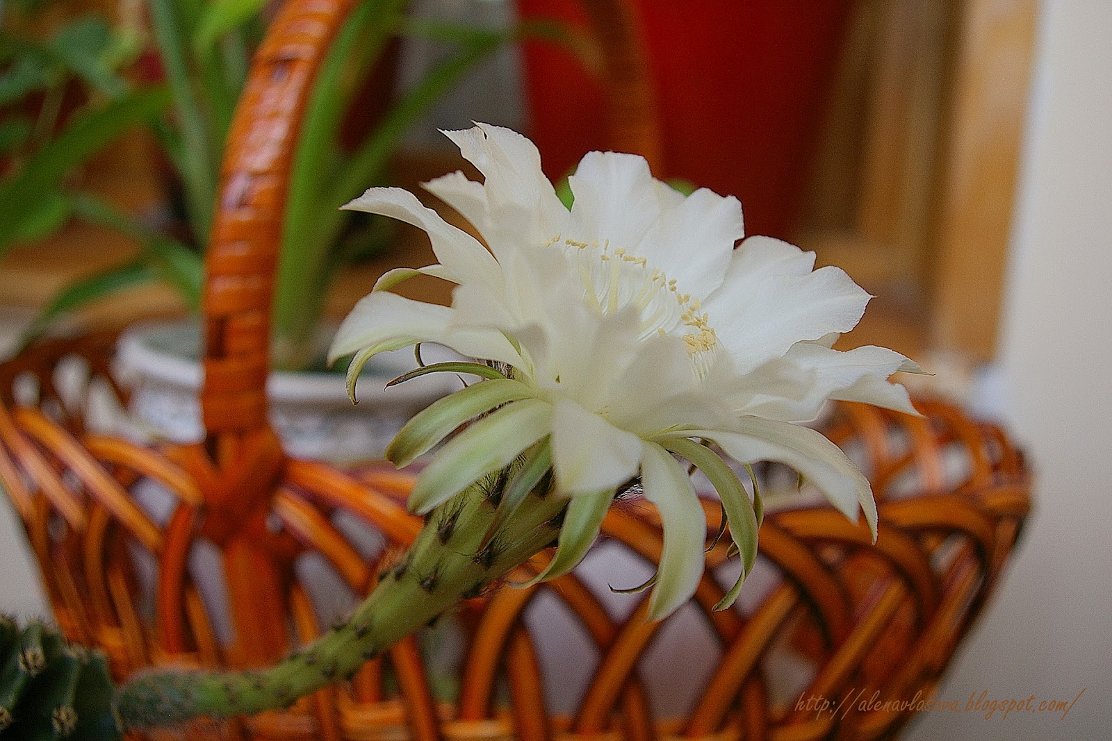 А еще у меня зацвёл кактус:))) Я даже не подозревала что он вообще умеет это делать:) Этому кактусу уже лет пять, когда-то отвалился от большого маминого, я забрала к себе, воткнула в землю и забыла. Не очень я люблю кактусы, но держу парочку, от воров:)) Аха, есть такая примета, кактус на подоконнике защищает от воров:)) Держу:)) А он вдруг вот те раз...выпустил здоровенную стрелку и зацвёл, ровно на сутки, сейчас уже цветка нет...а жаль, такая красота была...и запах потрясающий:)